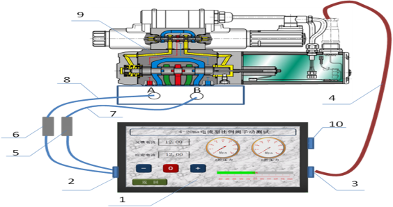 1、在線判斷液壓控制閥設備故障;在現(xiàn)代化的生產(chǎn)線包含有液壓控制閥的設備一旦出現(xiàn)故障,普通員工很難判斷是機械故障、液壓故障還是電氣控制故障;該儀器可解決上述問題,一步,斷開與液壓控制閥相連的電氣插頭,把本儀器配套的插頭插上,二步,將壓力傳感器的兩根測壓線連接到液壓控制閥的A、B口測壓點上,三步,打開本儀器電源,選擇與液壓控制閥相對應的信號,手動測試即可判斷是機械故障、液壓故障還是電氣控制故障;如下圖: