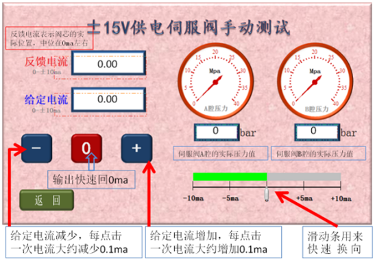 6、伺服閥正常時(shí)的表現(xiàn)為:a、給定電流0ma時(shí),反饋電流在0ma,伺服閥輸出的A、B腔壓力相同;b、用滑動(dòng)條可迅速換向,反饋電流改變且A、B腔壓力差較大;c、點(diǎn)擊增加按鈕,反饋電流逐漸增加且A、B腔壓力差逐漸增大;d、點(diǎn)擊減少按鈕,反饋電流逐漸減少且A、B腔壓力差逐漸減少,過(guò)0ma后伺服閥會(huì)換向;