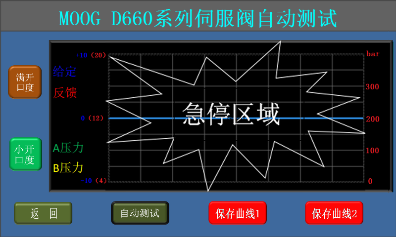 自動(dòng)測(cè)試過(guò)程中出現(xiàn)緊急情況,可點(diǎn)擊屏幕中間黑色的曲線部分,儀器將給伺服閥斷電,重新選擇開口度后儀器會(huì)再次給伺服閥上電;